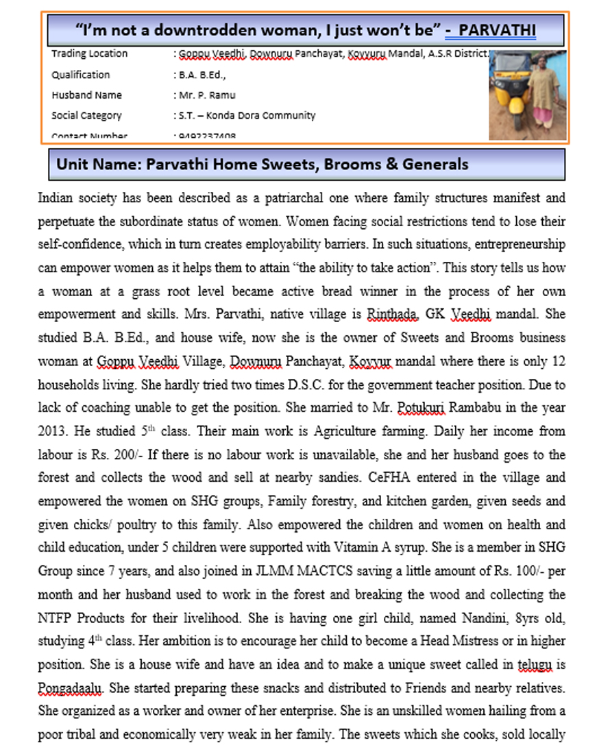 Her ambitions are to register a Society for the Green Ambassadors as “Green Ambassadors Collective on Climate Change” (GrACCC) and succeeded. She Registered through CeFHA in August 2015 with the support of KNH and raised memberships more than 6152 members in 9 districts of AP; in north coastal Zone 3671 members of 3 districts (Visakha, Vizainagaram and Srikakulam) and in Kotauratla she raised 2609 members for the GrACCC Society, presently looking to expand this network throughout the country and take the message of protection of Mother Earth, Environment, Biodiversity conservation and Climate Change to as many people as possible. Her personal ambition is to work in an NGO and serve the people.