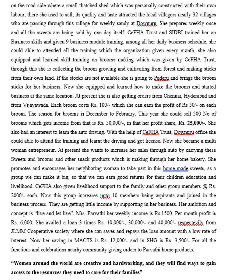 She raised an eco garden along with the child group members in the community waste land, planted papaya, banana and vegetables like tomato, Lady finger and Brinjal. In the evenings she mobilized all the children of the group for watering the plants in the eco garden and giving the sports materials like shuttle cocks; volley ball and indoor games like skipping roaps , caroms and rings as well as other story books to read. After completion of the games, she collects all the material and keeping in the Child centre. Then she encourages all the children to attend tuition in the village. During the Sundays, she was mobilizing the group members in clean and green work in the village. By seeing her interest ,commitment and the capacity in handling the programme activities of the child centre , CeFHA extended her various trainings and communication skills .she was also exposed to other areas to learn more and exchange ideas.